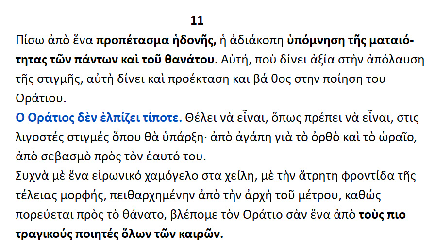 Πίσω από ένα προπέτασμα ηδονής , η αδιάκοπη υπόμνηση της ματαιότητας των πάντων και του θανάτου. Ο Οράτιος δεν ελπίζει τίποτα .Θέλει να είναι όπως πρέπει να είναι , στις λιγοστές στιγμές όπου θα υπάρξei , από αγάπη για το ορθό και το ωραίο , από σεβασμό στον εαυτό του. Ο Οράτιος είναι ένας από τους πιο τραγικούς ποιητές όλων των εποχών. Οι επιρροές του Ορατίου από την αρχαία Ελληνική Λυρική ποίηση είναι εμφανείς .