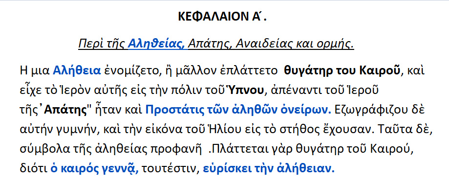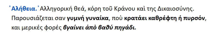 Η Αλήθεια είναι συμβολική θεά{ πλασμένη} θυγατέρα του Καιρού. Διότι ο καιρός γεννά ,τουτέστιν ευρίσκει την αλήθειαν. Την ζωγράφιζαν γυμνή έχουσα στο στήθος την εικόνα του Ηλίου, προφανή σύμβολα αληθείας.