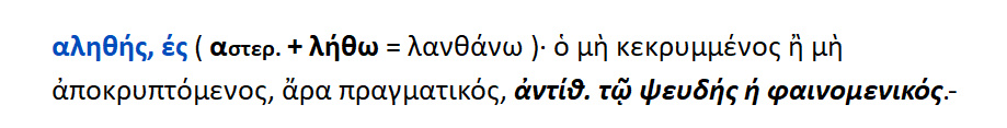 Αληθής-ές { α στερ. + λήθω < λανθάνω } = αυτός που δεν κρύβεται ή αυτός που δεν μπορεί να κρυφτεί. Άρα ο πραγματικός .Αντίθετο στο Ψευδής ή φαινομενικός.