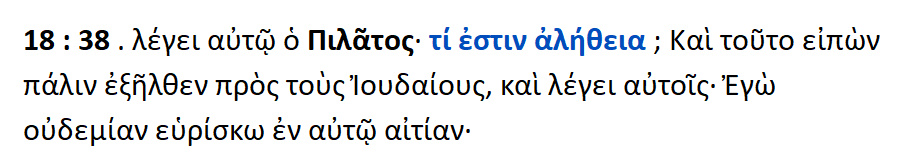 Ο Πιλάτος διατυπώνει το ερώτημα » Tί είναι αλήθεια » στον Θεάνθρωπον Ιησού ,αλλά ο Χριστός δεν απάντησε..