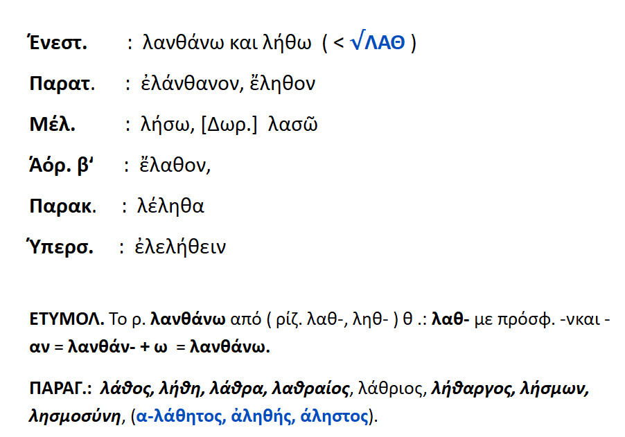 Λανθάνω .Παράγωγα : λάθος , λήθη , λάθρα , λαθραίος , λήθαργος , λήσμων , λησμονιά, α-λάθητος ,α-ληθής , ά-ληστος .