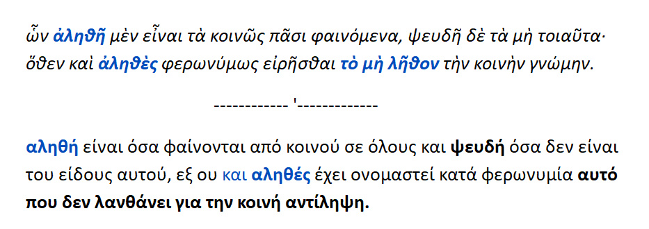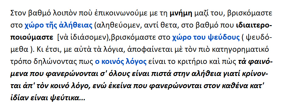 [ αναφορά σε Σέξτο Εμπειρικό ]. Αλήθεια και μνήμη .Ψεύδος και ιδιαιτερότητα. Το κριτήριο του κοινού λόγου. Τα φαινόμενα που φανερώνονται σ’ όλους είναι πιστά στην αλήθεια [ διότι κρίνονται από τον κοινό λόγο]. Τα φαινόμενα που φανερώνονται στον καθένα κατ’ ιδίαν είναι ψεύτικα.