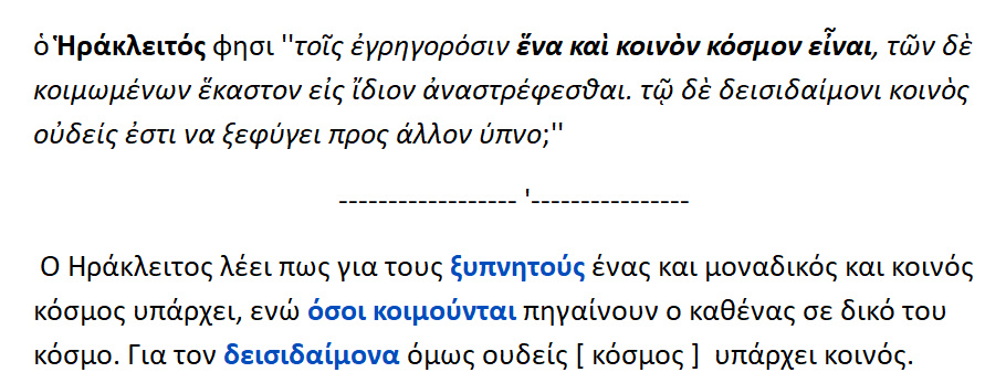 Ηράκλειτος : Για τους ξυπνητούς ένας και κοινός κόσμος υπάρχει, ενώ όσοι είναι κοιμισμένοι πηγαίνουν ο καθένας σε δικό του κόσμο.
