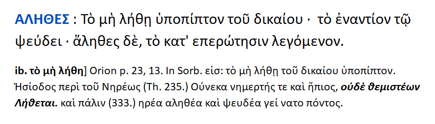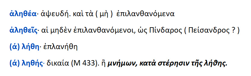 Αληθέα = αψευδή .και αυτά που δεν λησμονούνται – Αλήθη = επλανήθη – Αληθής = δικαία ή μνήμων , κατά στέρησιν της λήθης.