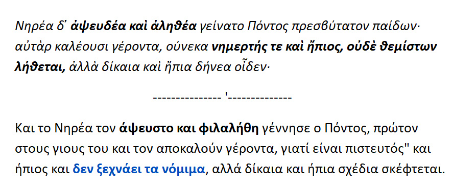 Ο Νηρέας είναι αψευδής και φιλαλήθης .Τον αποκαλούν γέροντα γιατί είναι και αναμάρτητος κι ήπιος και δεν ξεχνάει τα νόμιμα { ου λήθεται θεμίστων }.