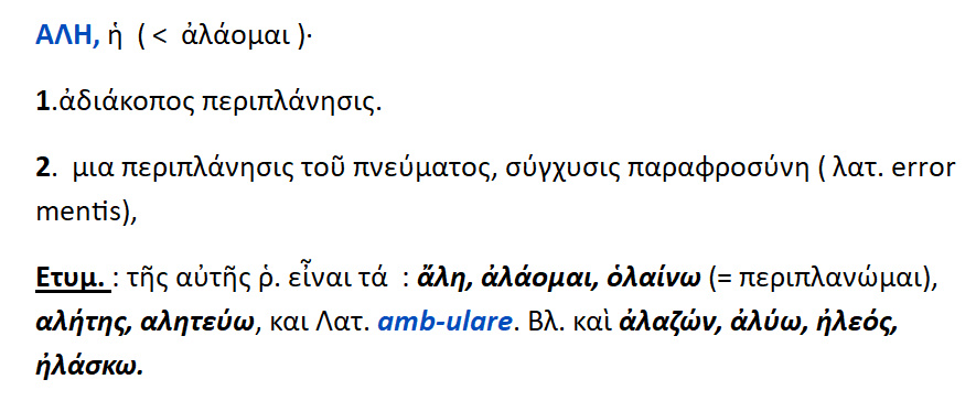 Άλη = αδιάκοπη περιπλάνηση,{ μτφ.} η περιπλάνηση του πνεύματος .