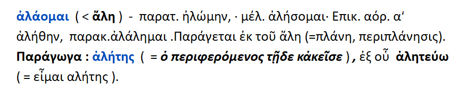 Αλάομαι -ώμαι { < άλη } = περιπλανώμαι. ΑΟΡ. Αλήθην και Ηλήθην .