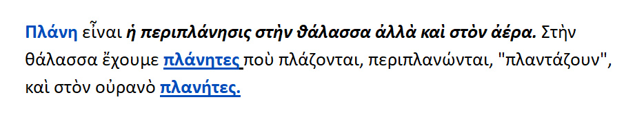 Πλάνη = περιπλάνηση στην θάλασσα { πλάνητες } και στον αέρα { πλανήτες }.