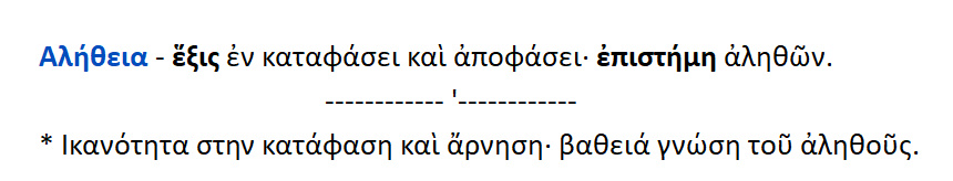 Αλήθεια : έξις στην κατάφαση και αποφάση – επιστήμη των αληθών. Τι ακριβώς θέλει να μας πει ο Σπεύσιππος , πρώτος σχολάρχη της Πλατωνικής Ακαδήμειας και ανιψιός του Πλάτωνος ; Η αλήθεια είναι μια συνήθεια { έξις }του σώματος ή του πνεύματος , η οποία συνίσταται στην κατάφαση [ ναι ] και στην άρνηση [ ου]. Η αλήθεια προσεγγίζεται δηλαδή , με ερωτήσεις και απαντήσεις συγκεκριμένες και συμβατικές, όπως το ναι ή το ου [ όχι ].Διότι αυτή είναι η οδός προς την βαθειά γνώση του αληθούς. Αλλά τι είναι ερώτηση και τι απάντηση ,οι οποίες μας οδηγούν στην επιστήμη των αληθών;