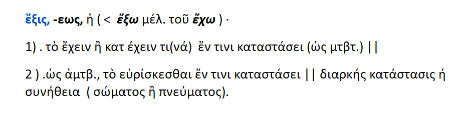 Έξις =το να έχεις ή να κατέχεις κάτι σε κάποια κατάσταση 2.διαρκής κατάσταση ή συνήθεια [σώματος ή πνεύματος].