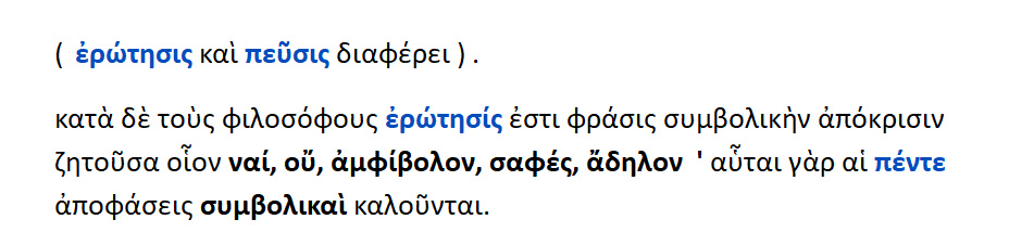 Ερώτησις και πεύσις διαφέρει . Στην φιλοσοφία , η ερώτηση είναι φράση η οποία επιζητεί συμβολική απόκρισιη Συμβολικές αποκρίσεις είναι πέντε {5} : ναι ,όχι , αμφίβολον ,σαφές ,άδηλον .