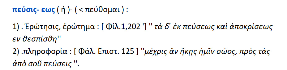 Πεύσις { < πεύθομαι < πυνθάνομαι = ζητώ να μάθω ,πληροφορούμαι } = ερώτησις , ερώτημα 2]. πληροφορία.