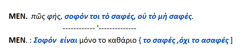 Η πεύσις δεν είναι ερώτησις ,διότι δεν έχει ούτε απαιτεί τις [5] συμβατικές αποκρίσεις που υπάρχουν αναγκαστικά στην ερώτηση. Όπως παραδείγματος χάριν ,το ‘τί έφαγες ‘ ή το ‘πού μένεις ‘δεν μπορούν ν’ απαντηθούν συμβατικά και μονολεκτικά. Άρα στην φιλοσοφία τα ερωτήματα πρέπει να έχουν -όσο το δυνατόν- μονολεκτικές απαντήσεις .Δεν αγαπάει η σοφία το ασαφές ,ούτε το πολυώνυμον και ληρόν μπορεί να έχει σαφήνεια. Η αλήθεια μπορεί να ειπωθεί με απλά λόγια ,με ένα ναι ή με ένα όχι. Διότι είναι απλή , αφτιασίδωτη και γδυτή ,ενώ το ψέμα τα αντίθετα από αυτά.