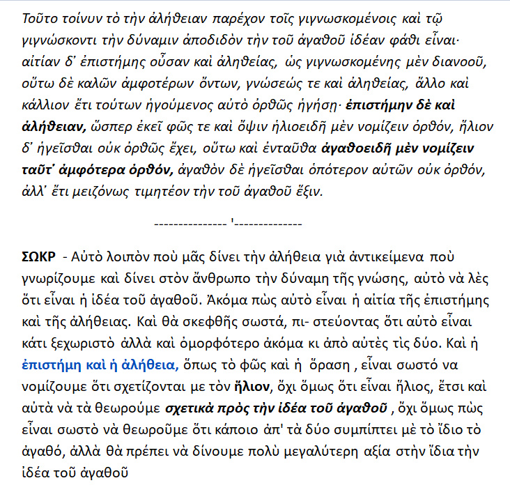 Και η επιστήμη και η αλήθεια σχετίζονται με το αγαθόν ,όπως το φως και η όραση σχετίζονται με τον ήλιο. Και ο ήλιος είναι αγαθόν και το αγαθόν ήλιος.