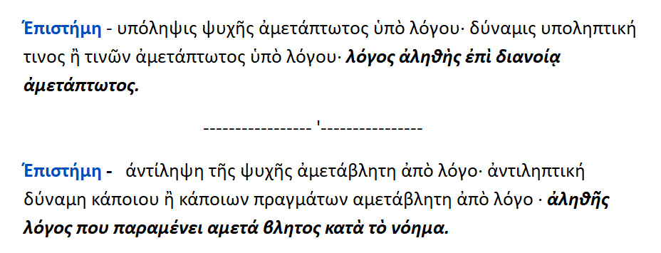 Επιστήμη : αντίληψη της ψυχής ακλόνητη λογικώς. Δύναμη κατανοήσεως κάποιου ή κάποιων πραγμάτων ακλόνητη λογικώς .Λόγος αληθής εντός της διανοίας ακλόνητος.