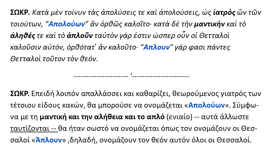 Ο Απόλλων είναι θεός της Μουσικής , της Μαντικής ,της Ιατρικής και της Τοξευτικής. Έχει δηλαδή τέσσερις δυνάμεις. Το όνομα του θεού δε εκφράζει και τις [4] τέσσερις αυτές δυνάμεις εάν ικανώς αποκωδικοποιηθεί { Απόλλων = Απολούων + Άπλουν +Αειβάλλων+ Ομοπολών } …Σύμφωνα και με τις απολύσεις [ ελευθερώσεις ] και με τις απολούσεις [ καθαρισμούς ] ως γιατρός τέτοιου είδους κακών , θα ήταν ορθό να ονομάζεται » Απολούων ». Σύμφωνα με την μαντική , το αλήθές και το απλούν –διότι αυτά είναι το ίδιο -ορθότατα ο Απόλλων θα μπορούσε να ονομάζεται ,όπως τον αποκαλούν οι Θεσσαλοί , »Άπλουν».