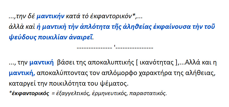 Αλλά και η μαντική , αποκαλύπτοντας τον απλόμορφο χαρακτήρα της αλήθειας , καταργεί την ποικιλομορφία του ψεύδους.