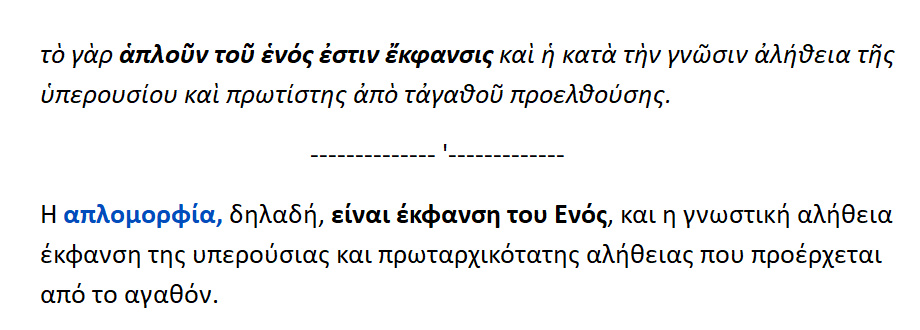 Η απλομορφία είναι έκφανση του Ενός και η γνωστική αλήθεια έκφανση της υπερουσίας** και πρωταρχικοτάτης αληθείας που προέρχεται από το αγαθόν.