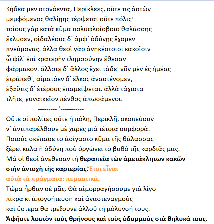 Ο Αρχίλοχος πενθεί για τον αγαπημένο του φίλο Περικλή , ο οποίος χάθηκε σ’ ένα ναυάγιο .Στα αγιάτρευτα αυτά δεινά αντιτάσσει –ως μόνο φάρμακο – την δύναμη της καρτερίας και συμβουλεύει τους οικείους να αντέξουν τον πόνο τους ,διώχνοντας το γυναικείο πένθος { κλάματα }.