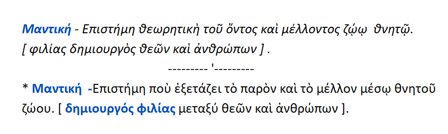 Μαντική : επιστήμη διαβλέπουσα το παρόν και το μέλλον μέσω θνητού ζώου.[ δημιουργός φιλίας μεταξύ θεού και ανθρώπων ].