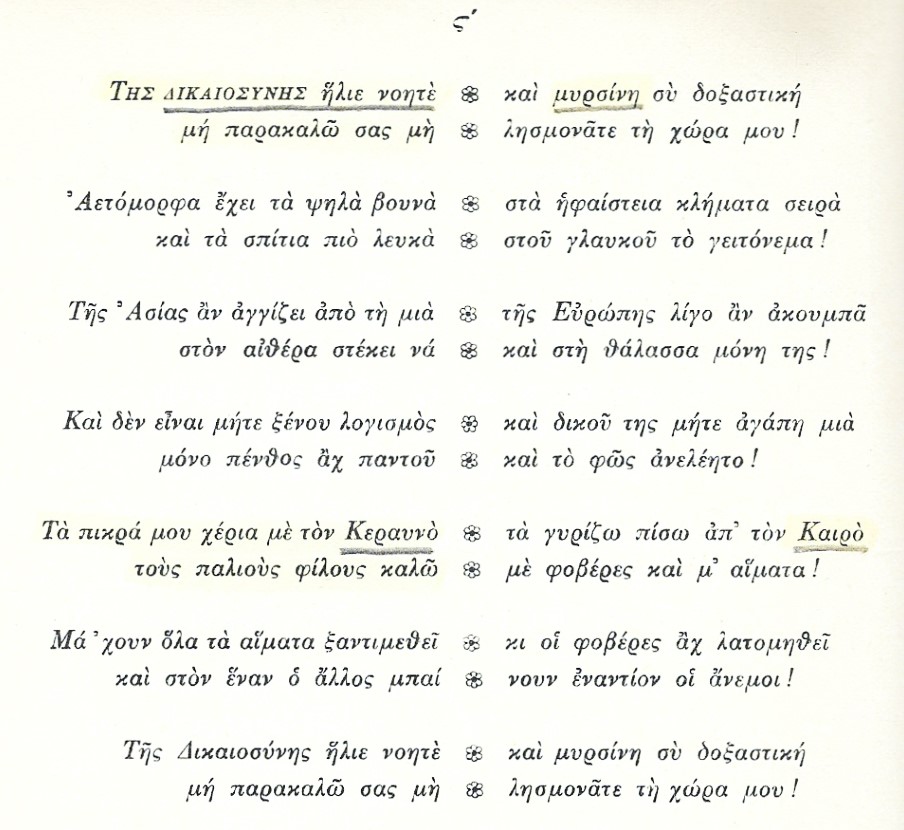 Ο μεγάλος μύστης -ποιητής μας γράφει για τον νοητό ήλιο της Δικαιοσύνης { ουδέ θεμίστων λήθεται } , για την μυρσίνη { μυρτιά ,σύμβολο παρθενίας } ,για τον Καιρό { Αλήθεια , θυγατέρα του Καιρού } και τον Κεραυνό.