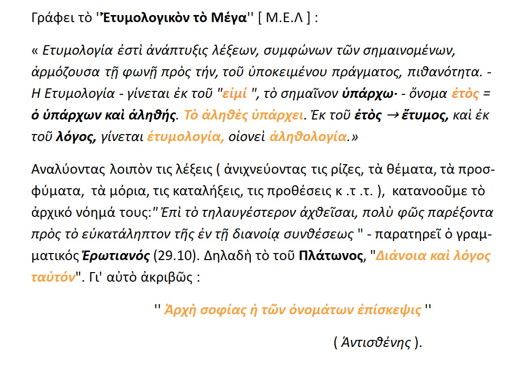 Εκ του ετός → έτυμος, και εκ του λόγος, γίνεται Ετυμολογία, οιονεί Αληθολογία.
