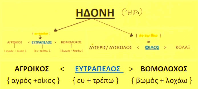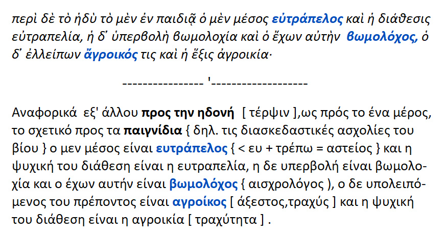 Στην ηδονή{ το ηδύ } ,την σχετική με τα παιγνίδιακαι τις διασκεδάσεις,ο μέσος είναι ο ευτράπελος και η ευτραπελία. Το μεν ένα άκρο [ της υπερβολής ] λέγεται βωμολοχία{ αισχρολογία} το δε άλλο άκρο [ της ελλείψεως ] λέγεται αγροικία { τραχύτητα }.