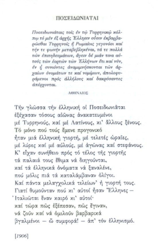 Προφητικός ο λόγος του μεγάλου Αλεξανδρινού ποιητή. Ορμώμενος από το ιστορικό γεγονός της υποταγής των Ποσειδωνιατών στους βαρβάρους Λευκανούς συνθέτει το μαγικό αυτό ποίημα , περιγράφοντας με αδρές πινελιές… το μέλλον της Ελλάδος.! » Και τώρα πώς εξέπεσαν, πώς έγιναν, Να γράφουν και να ομιλούν βαρβαρικά βγαλμένοι –ω συμφορά!- απ’ τον ελληνισμό ;»