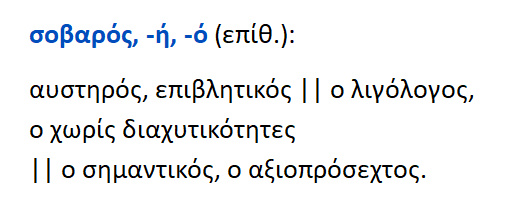 Τι σημαίνει όμως το επίθετοσοβαρός-η-ο ; Ποίος είναι άραγε αυτός ο σοβαρός και τι σόι’ πράγμα είναι αυτή η σοβαρότητα,που διαθέτει ; Ας συμβουλευτούμε κατ’ αρχήν, το σύγχρονο λεξικό της Ακαδημίας Αθηνών ή αλλιώς χρηστικό, για να μας διαφωτίσει.