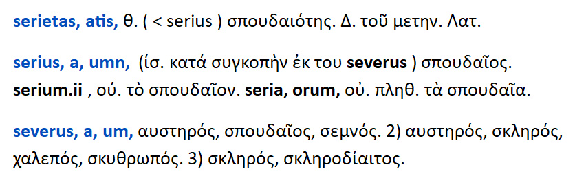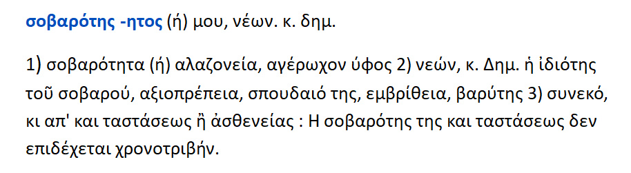 Το καλό ‘xρηστικό ‘ λεξικό ερμηνεύει μεν τι σημαίνει σοβαρότητα {seriousness} και σοβαρός {serioso} ,με παραδείγματα μάλιστα ,χωρίς να φθάνει δε στην ουσία της λέξεως ,ήτοι στην ετυμολογία της.