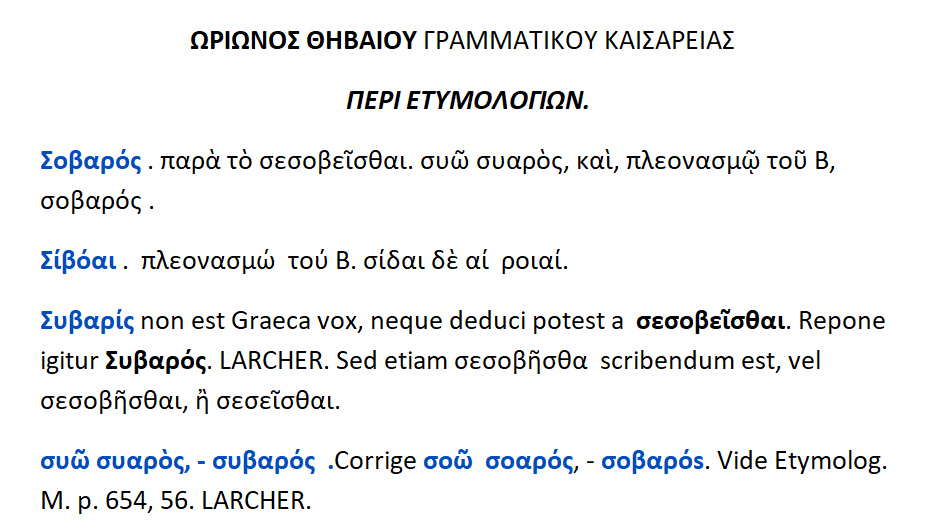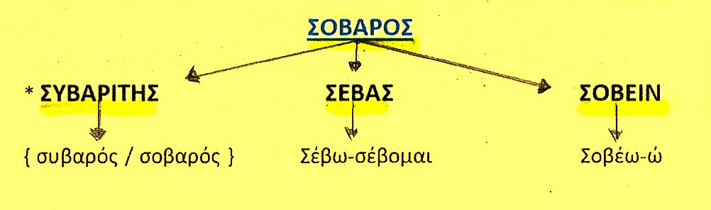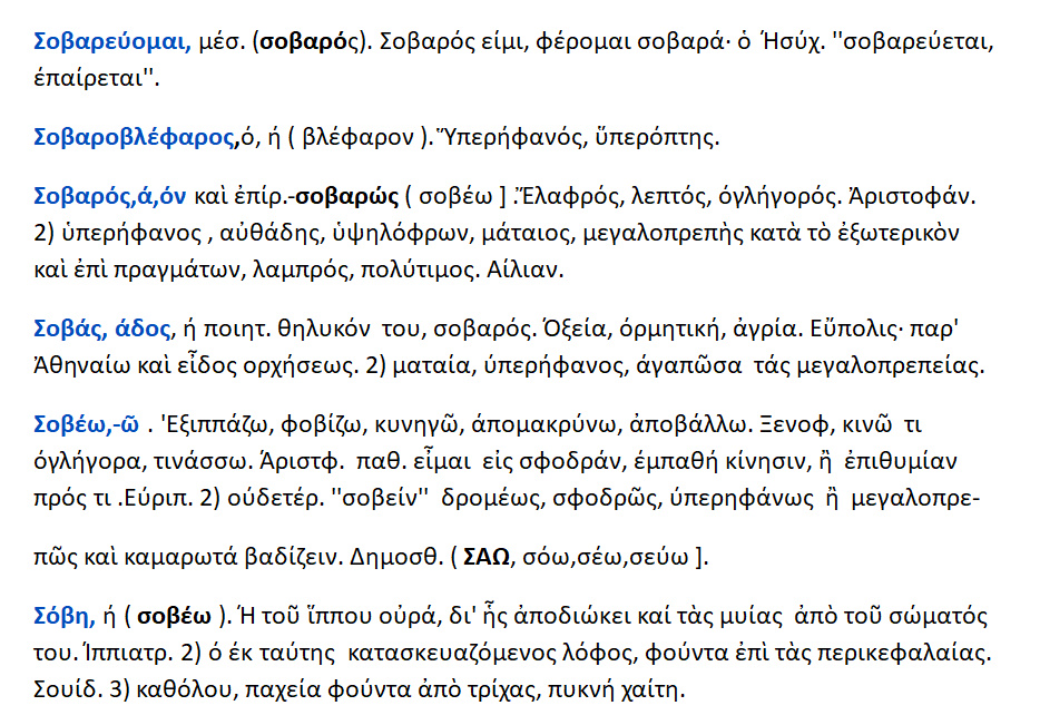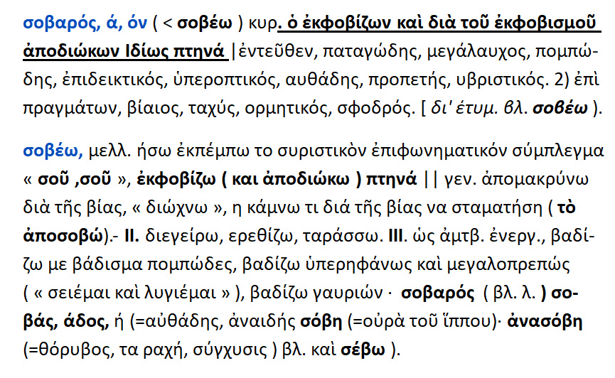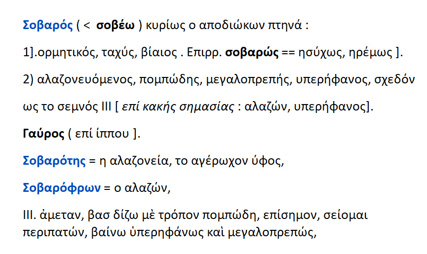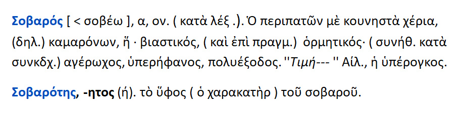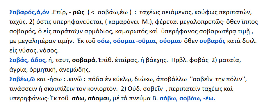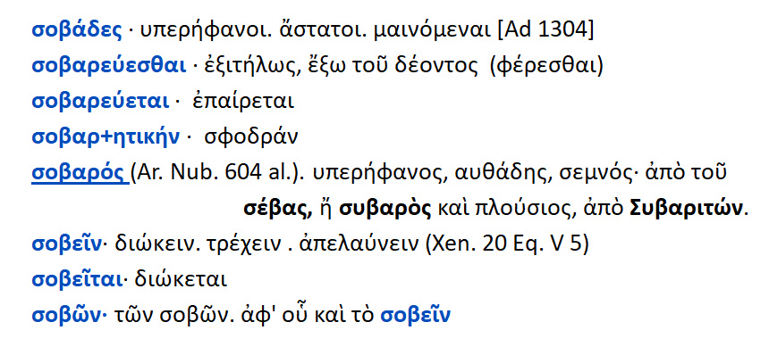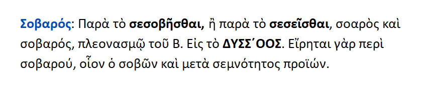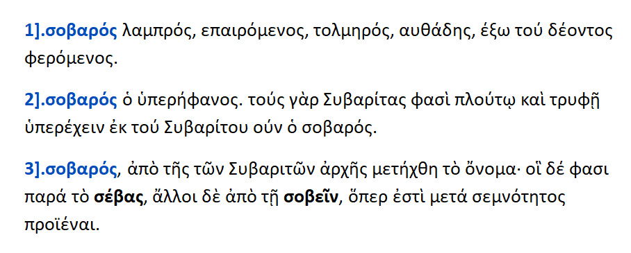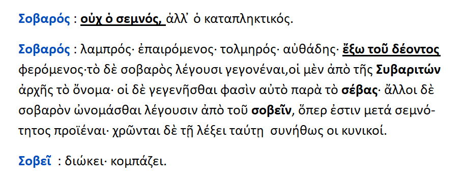 Σοβαρός[1] = λαμπρός , επαιρόμενος ,τολμηρός ,αυθάδης , ο συμπεριφερόμενος έξω του δέοντος [=απρεπώς } Σοβαρός [2] = ο υπερήφανος .Διότι έλεγαν πως οι Συβαρίτες υπερέχουν στον πλούτο και την τρυφηλότητα. Από του Συβαρίτου λοιπόν [ ονομάσθηκε ] ο σοβαρός. Σοβαρός [3] = από το κράτος των Συβαριτών μεταφέρθηκε το όνομα . Άλλοι μεν λένε ότι [ο σοβαρός ] παράγεται από το σέβας, άλλοι δε από το σοβείν , το οποίο σημαίνει ακριβώς : το να βαδίζει κάποιος με σεμνότητα.