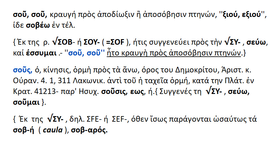Σοβαρός -α-ον { < σοβέω } = 1.Ο εκφοβίζων και δια του εκφοβισμού αποδιώκων πτηνά 2. παταγώδης ,μεγάλαυχος ,πομπώδης ,επιδεκτικός ,υπεροπτικός ,αυθάδης,υβριστικός 3.[επί πραγμάτων ] βίαιος,ταχύς,σφοδρός. Σοβέω =εκπέμπω το συριστικό επιφωνηματικό σύμπλεγμα ‘‘σού,σού » για να εκφοβίσω και να αποδιώξω πτηνά {όσοι είστε από χωριό ή έχετε πάει σε χωριό που έχουν κοτέτσια , μπορεί να έχετε εικόνα , του πώς διώχνουν οι νοικοκυρές τα κοτερά { κότες} από την αυλή του σπιτιού προφέροντας το χαρακτηριστικό επιφώνημα » σ,σ,σ,σ,….σ,σ,σ,..» }.Σοβάς-άδος [ θηλ. του σοβαρός ] = αυθάδης, αναιδής. Σόβη = η ουρά του ίππου { αλογοουρά }.