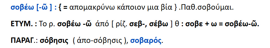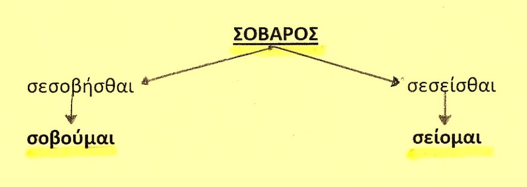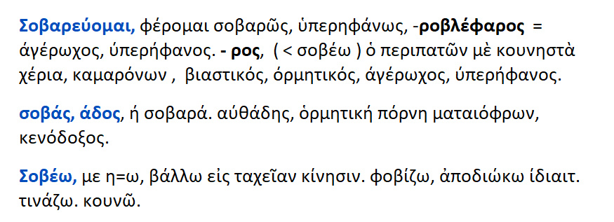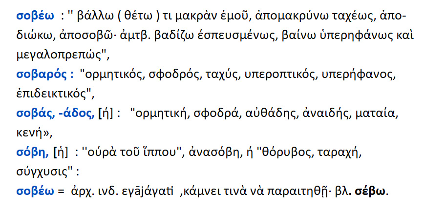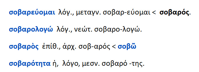 Σοβαρεύομαι { < σοβαρός } = είμαι σοβαρός ,επαίρομαι { Ησύχιος }. Σοβαροβλέφαρος = υπερήφανος ,υπερόπτης. Σοβαρός-α-ον =1. ελαφρός ,λεπτός , ογλήγορος { =γρήγορος } 2.υπερήφανος, αυθάδης ,υψηλόφρων,μάταιος,μεγαλοπρεπής { κατά το εξωτερικόν και επί πραγμάτων },λαμπρός ,πολύτιμος{ Αιλιανός }. Σοβάς-άδος { ποιητικό θηλυκό του σοβαρός }=οξεία, ορμητική, άγρια 2.Μάταιη ,υπερήφανη , που αγαπάει τις μεγαλοπρέπειες .Σοβέω-ώ { < ΣΑΩ ,σόω,σέω,σεύω} =1].εξιππάζω,φοβίζω ,κυνηγώ ,απομακρύνω , αποβάλλω 2].υπερήφανα ή καμαρωτά βαδίζω . Σόβη { < σοβέω} =1]. η ουρά του ίππου { ίππουρις }, δια της οποίας αποδιώκει τις μύγες από το σώμα του 2].η φούντα ,ο θύσανοςαπότρίχεςουράςίππουγιαδιακόσμησηπερικεφαλαίας 3].παχιά φούντα από τρίχες ,πυκνή χαίτη.