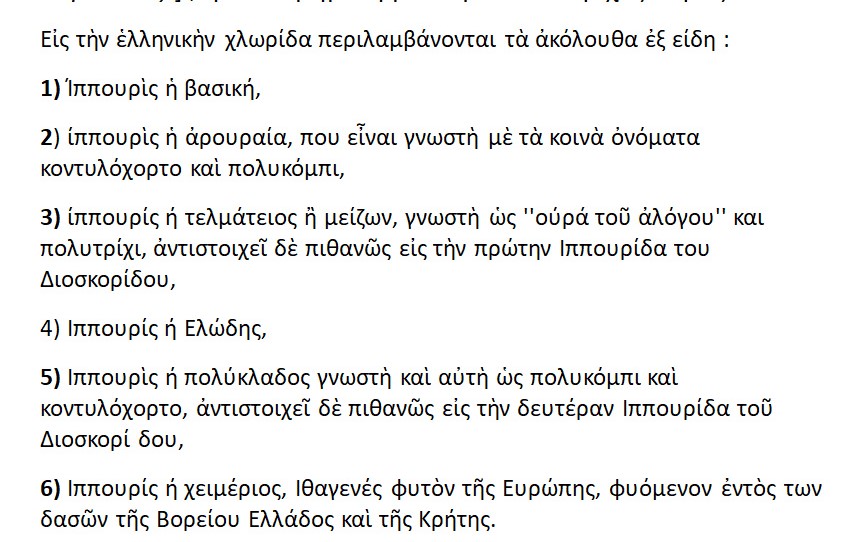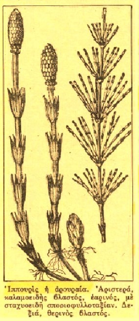 γ].Ίππουρις [Equisetum arvense] {2} εκουιζέτο ή πολυκόμπι,κοντυλόχορτο,πολυτριχιά,πολυκόνδυλο,ιππουρίδα των αγρών.Ο Διοσκουρίδης αναφερόμενος στο πολυκόμπι το συνιστούσε ως επουλωτικό των πληγών και γι’ άλλες φαρμακευτικές χρήσεις.Επίσης χρησιμοποιείται ως φυτοφάρμακο στην αμπελουργία και στην κηπευτική.