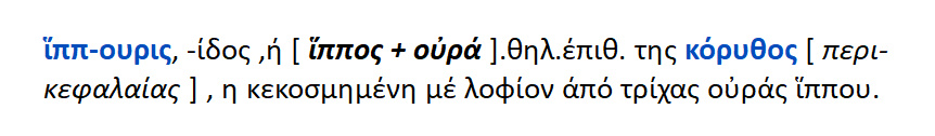 α].Ίππουρις{ ίππος + ουρά } =επίθετο της κόρυθος { περικεφαλαία} η διακοσμημένη με λοφίο από τρίχες αλογοουράς.