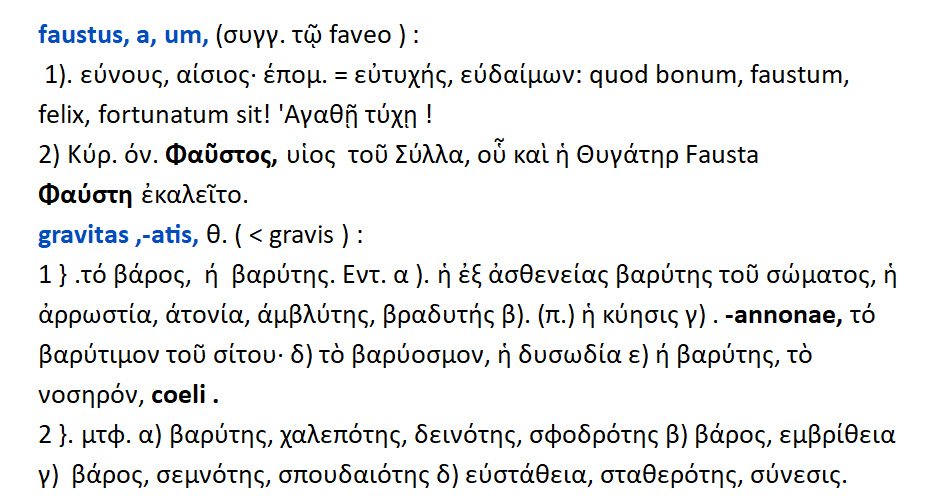 Fastus-us=όγκος ,φρόνημα,υπερηφάνεια , το θρυπτικόν { = ο θραύων, ο ικανός να συντρίβει κάτι } .Gravitas -atis { < gravis }= βαρύτητα , βάρος, τραχύτητα ,εμβρίθεια,σεμνότητα , σπουδαιότητα, αυστηρότητα.