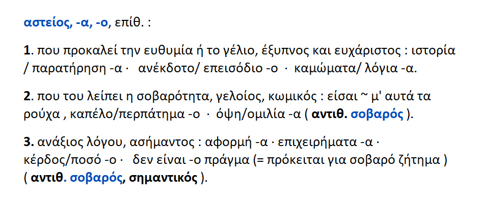 Aστείος– στην εποχή μας -είναι ο έξυπνος, ο ευτράπελος αλλά και ο ασήμαντος ,ο μηδαμινός ,ο μη σοβαρός ,ο ανάξιος λόγου ,ο γελοίος ,ο κωμικός- όπως μας πληροφορεί το Νεοελληνικό λεξικό της σύγχρονης ελληνικής δημοτικής.