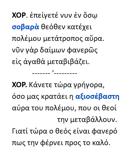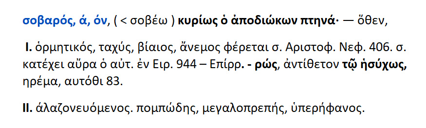 Προσέξτε την αλλοίωση του νοήματος της λέξης. Από το Αριστοφανικό σοβαρό= ελαφρό ,πτερόεν ,ευκίνητο στο νεώτερο σοβαρό , που είναι το αντίθετο του ..ελαφρού και επιπόλαιου.!