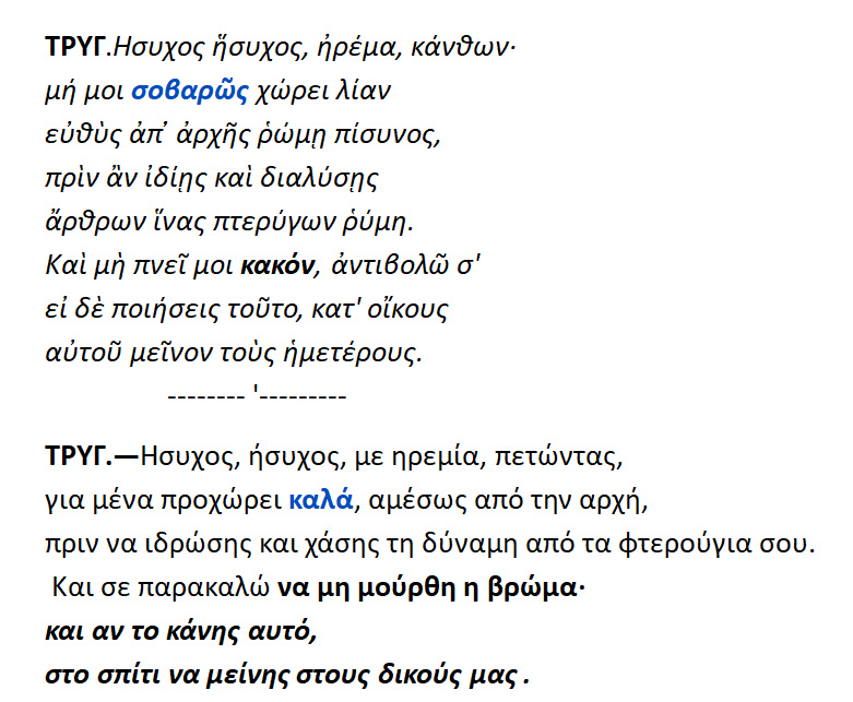 Ο Τρυγαίος εμφανίζεται στην σκηνή καβάλα σ’ένα τεράστιο σκαθάρι { κάνθαρος } σαν τον Βελλερεφόντη ,που ίππευσε τον Πήγασο και ανέβηκε στον ουρανό. Ο μπούρμπουλας { σκαθάρι} ως γνωστόν είναι κοπροφάγος και εκπέμπει δυσωδία , αφού τρώγει βρώμες ,κάτι το οποίο φοβίζει τον Τρυγαίο. Σοβαρώς χώρει =προχώρα ταχέως ,ορμητικώς. Σοβαρά αύρα = γρήγορη ,ορμητική.