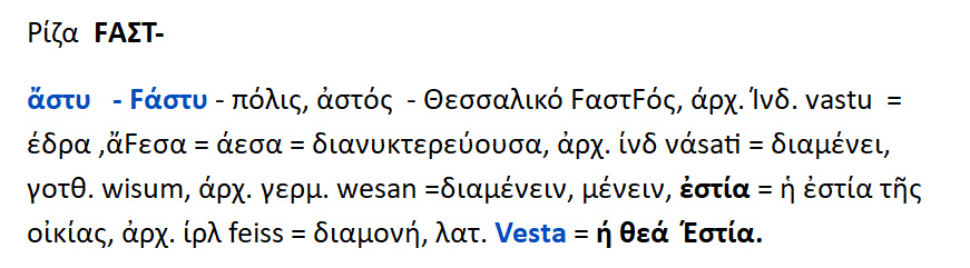 Άστυ { < [F]άστυ }. Vestia = Εστία.