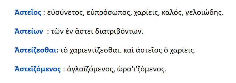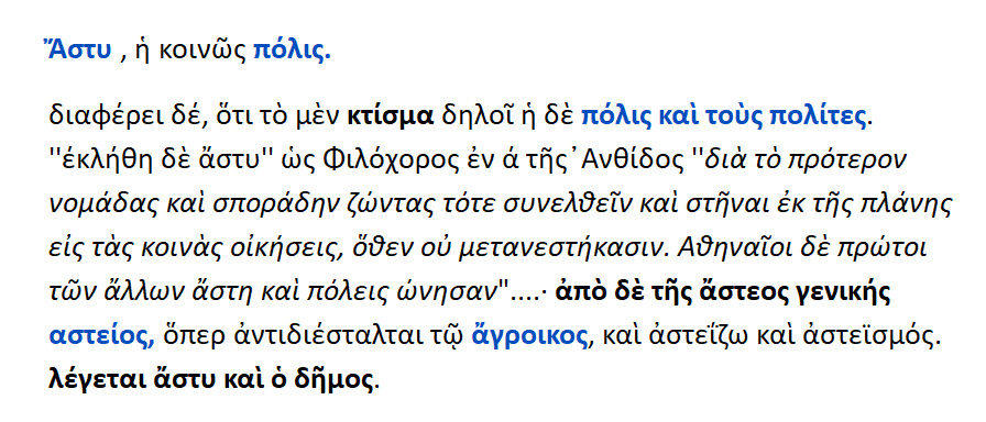 Άστυ, η κοινώς λεγομένη πόλη .Διαφέρει το άστυ από την πόλιν .Άστυ= κτίσμα. Πόλις = κτίσματα { άψυχα} και πολίτες { έμψυχα }.Ονομάστηκε δε άστυ, ‘‘εκ του συνελθείν και στήναι’‘, επειδή πρωτύτερα ήσαν νομάδες και ζούσαν πότε εδώ και πότε εκεί . Τότε εκ της πλάνης{ = περιπλάνηση νομάδων } εις τας κοινάς οικήσεις {εγκαταστάθηκαν μονίμως }, απ’ όπου δεν μετανάστευσαν. Πρώτοι από τους άλλους οι Αθηναίοι κατοίκησαν πόλεις και εύρηκαν άστη. Από το άστυ {γεν. άστεος }:o αστείος , ο οποίος αντιδιαστέλλεται στον αγροίκον , το αστείζω και ο αστεισμός { είδος ειρωνείας }.