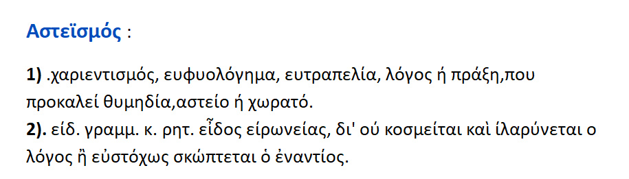 Αστε’ι’σμός : α].ευφυολόγημα και ευτραπελία. β].Ρητορ. είδος ειρωνείας ,δια του οποίου διακοσμείται και ιλαρύνεται { φαιδρύνεται} ο λόγος ή σκώπτεται { σκώπτω =περιπαίζω,’πειράζω’ }εύστοχα ο εναντίος { =ο αντίος ,ο απέναντι }.