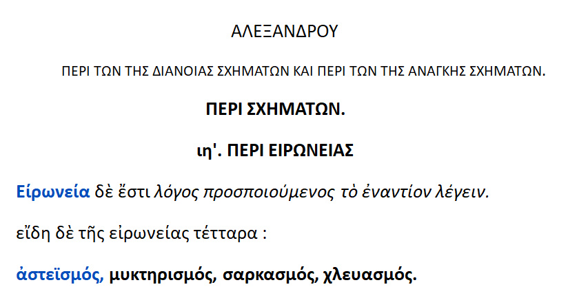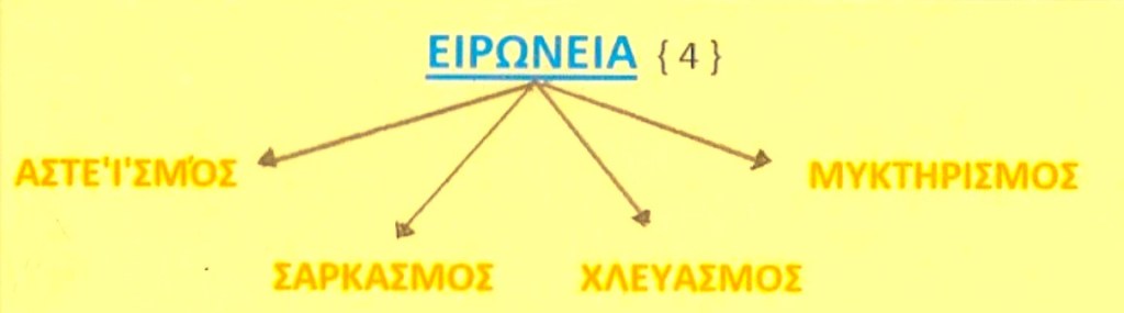 Ειρωνεία = λόγος προσποιούμενος το εναντίον λέγειν. Είδη της ειρωνείας {4} : αστεισμός,μυκτηρισμός , σαρκασμός , χλευασμός.