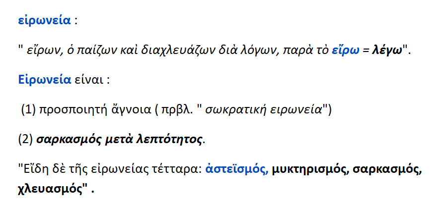 Ειρωνεία{ < είρω = λέγω } = ο παίζων και διαχλευάζων διά λόγων . Ειρωνεία είναι : α].η προσποιητή άγνοια { σωκρατική ειρωνεία } και β].σαρκασμός μετά λεπτότητος. Η ειρωνεία έχει [4] είδη: