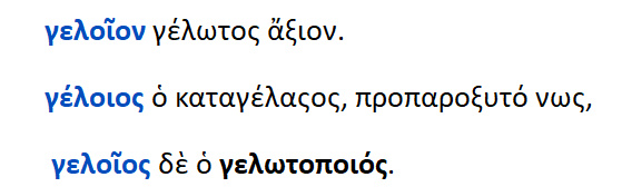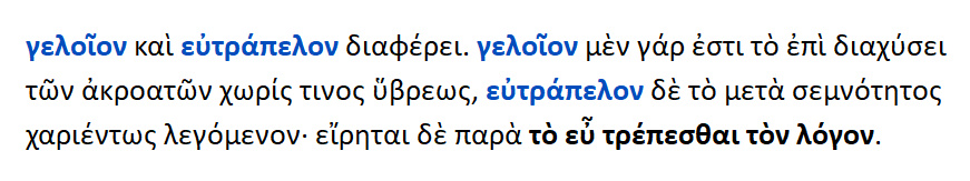 Γελοίον=το λεγόμενον , που διαχέεται στους ακροατές χωρίς κάποια ύβρη { προσβολή}. Ευτράπελον {= το ευ τρέπεσθαι τον λόγον } : αυτό που λέγεται με σεμνότητα και χάρη.