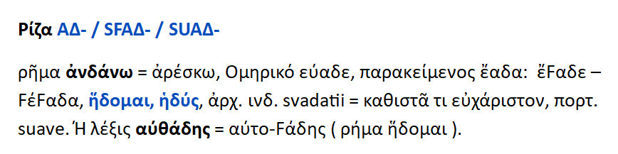 Από ρ. [ ΣFΑΔ-] η ρ. [ΑΔ-] : ανδάνω ,ήδομαι ,ήδος ,ηδονή ηδύς { αδύς },ήδυμος.