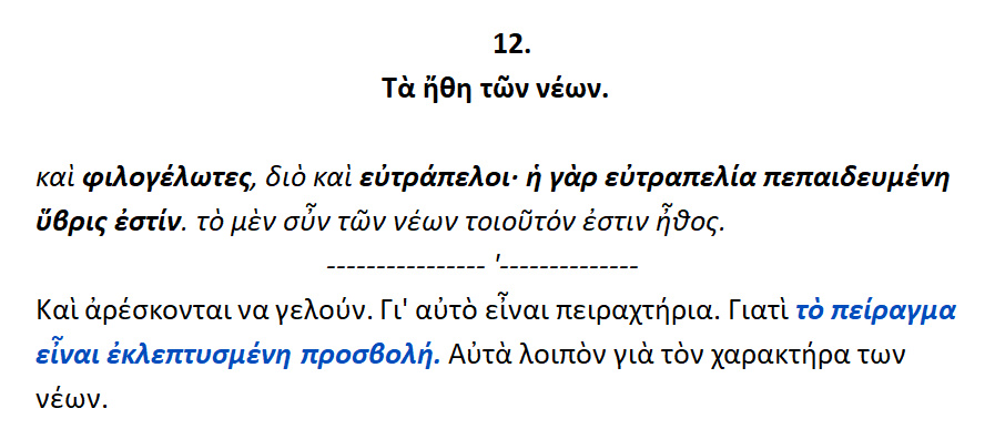 Οι νέοι είναι φιλογέλωτες{= αγαπούν να γελούν }.Γι αυτό είναι πειραχτήρια { ευτράπελοι }.Γιατί το πείραγμα{ ευτραπελία} είναι εκλεπτυσμένη { πεπαιδευμένη } προσβολή{ ύβρις }.