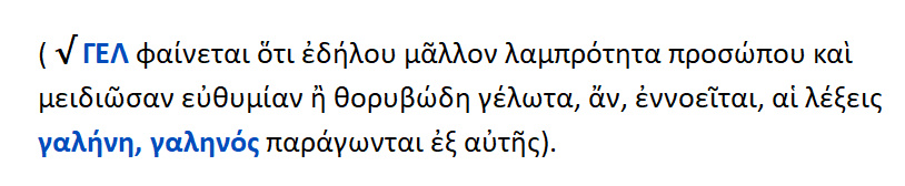 Γέλως { < ΓΕΛ – } . Η ρίζα [ ΓΕΛ-] απ’όπου και ο γέλως{ γέλιο } φαίνεται ότι δήλωνε μάλλον λαμπρότητα προσώπου και μειδιώσα ευθυμία παρά θορυβώδη γέλωτα. Διότι από την ρ.[ ΓΕΛ –] παράγονται και οι λέξεις γαλήνη , γαληνός.