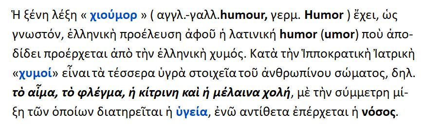 Η λέξη ‘χιούμορ’{ humour , humor < umor } προέρχεται από την ελληνική λέξη χυμός. Χυμοί είναι τα [4] υγρά στοιχεία του ανθρωπίνου σώματος : αίμα – φλέγμα – κίτρινη χολή – μέλαινα χολή. Η υγίεια διατηρείται με την σύμμετρη μίξη αυτών ενώ αντίθετα επέρχεται η νόσος.