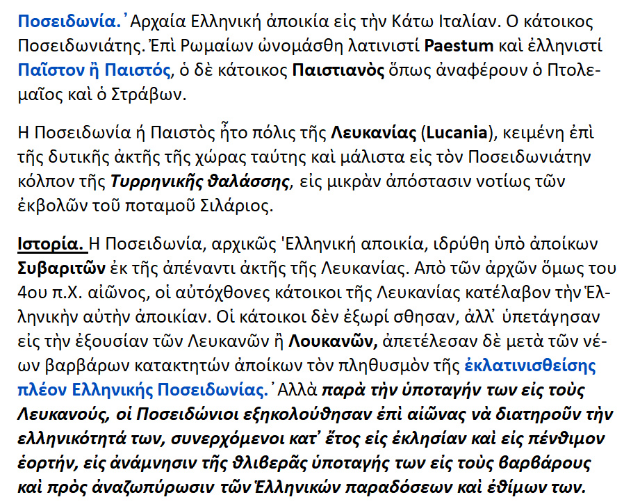Η Ποσειδωνία ήταν Αρχαία Ελληνική αποικία στην Κάτω Ιταλία. Επί Ρωμαίων ονομάστηκε Paestum , ελληνιστί Παιστόν ή Παιστός.Η Ποσειδωνία πόλη της Λευκανίας { Lucania },ήταν αρχικά Ελληνική αποικία που ιδρύθηκε από Συβαρίτες ** εκ της απέναντι ακτής της Λευκανίας. Από τις αρχές του 4ου αι. π. χ. οι αυτόχθονες κάτοικοι της Λευκανίας κατέλαβαν την Ελληνική αυτή αποικία. Οι κάτοικοι όμως δεν εξορίστηκαν αλλ’ υποτάχθηκαν στην εξουσία των Λευκανών και απετέλεσαν μαζί με τους νέους βαρβάρους κατακτητές αποίκους τον πληθυσμό της εκλατινισμένης πλέον Ελληνικής Ποσειδωνίας .Αλλά παρά την υποταγή στους Λευκανούς , οι Ποσειδώνιοι εξακολούθησαν επί αιώνες να διατηρούν την ελληνικότητά τους , συνερχόμενοι κάθε χρόνο εις εκκλησίαν και εις πένθιμον εορτήν , εις ανάμνησιν της θλιβερής υποταγής των εις τους βαρβάρους και προς αναζωπύρωσιν των Ελληνικών παραδόσεων και εθίμων των.
